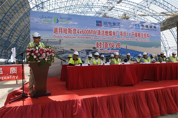 At 14:00 on May 22 local time in Dubai, the Dubai’s Hassyan 4x600MW Clean Coal-fired Project witnessed the key milestone work — the main truss structure of the dry coal shed at Coal Storage Yard 1 of the Dubai Hassyan Project was capped ten days ahead of schedule. A ceremony was held at the site in the presence of HEI, the Project Owner Hassyan Energy, the investment partner ACWA Power and GE, as well as representatives of the parties involved in the project.