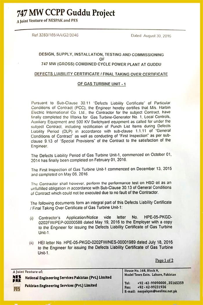 On August 31st, 2016, the Pakistani owner and the supervision company NESPAK awarded a DLC certificate for the No. 1 gas turbine of the Guddu 747 MW Combined Cycle Power Plant Project contracted by HEI, which marks the official transfer of the project. At this point, both of the gas turbine of the Guddu Project have received DLC certificates, and the project is striving for a factory DLC certificate.