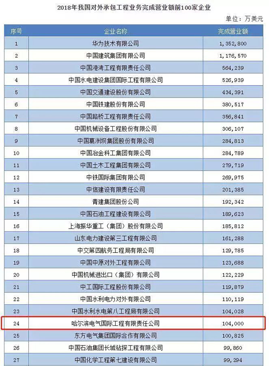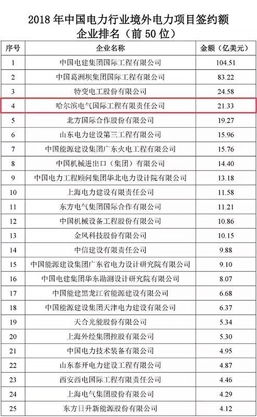 日前,中国机电产品进出口商会对各重点企业2018年境外电力项目的新签约情况进行了统计,并对企业签约额进行了排名。 乐天堂fun88集团以新项目签约额21.33亿美元入围2018年中国电力行业境外电力项目签约额企业排名,位列第4位;入围2018年中国电力行业境外火电项目签约额企业排名,位列第3位。 此前,乐天堂fun88集团入围了商务部发布的2018年我国对外承包工程业务完成营业额前100家企业,以营业额104,000万美元,位列第24位。