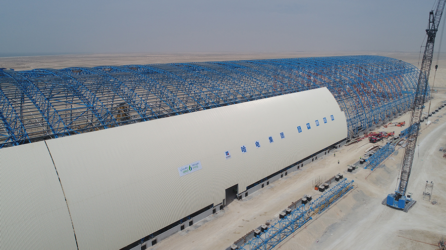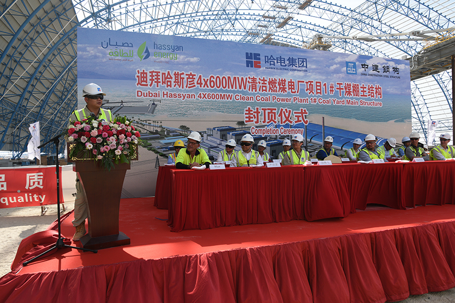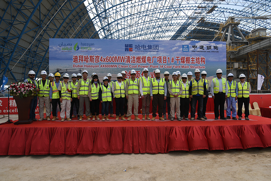 迪拜当地时间5月22日14时,迪拜哈斯彦4X600MW清洁燃煤电站项目迎来关键节点——1号储煤场干煤棚主桁架钢结构提前10天封顶。现场举行了封顶吊装仪式,乐天堂fun88集团、项目业主Hassyan Energy公司、投资合作伙伴ACWA Power、GE公司,以及参建单位代表参加封顶仪式。