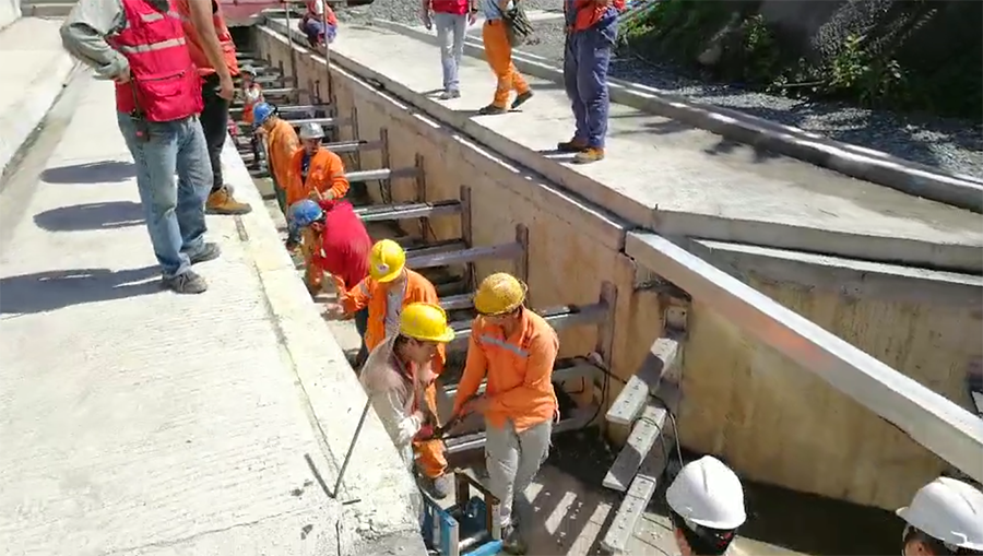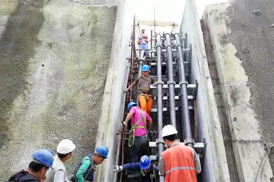 厄瓜多尔当地时间2018年8月27日,乐天堂fun88集团承建的厄瓜多尔美纳斯水电项目9根230kV高压电缆在直径6米、深440米通风电缆井下敷设完成,创下中国和厄瓜多尔最深竖井高压电缆敷设纪录,成为国际上较少掌握该技术的企业之一。 美纳斯水电项目9根230kV高压电缆,单根最长816米,施工技术要求高,难度大,尤其在440米深通风电缆井内安装作业更是典型的高风险、高难度工作。为了攻克这些难题,乐天堂fun88集团美纳斯项目部布置了30个电缆竖井井内专用敷缆机焊接平台及24台敷缆机,以及400余米深的竖井照明、电源,安装了60套敷缆专用工具四方滚轮以及180个直滑车。为了尽快完成敷设任务,乐天堂fun88集团美纳斯项目部在通风电缆井口搭建了双层防护,实施230kV电缆敷设和土建的通风室施工并行作业,为首台机组发电争取了宝贵时间。