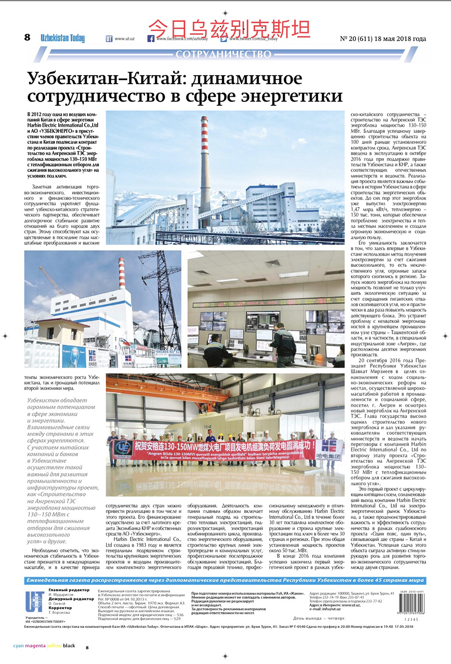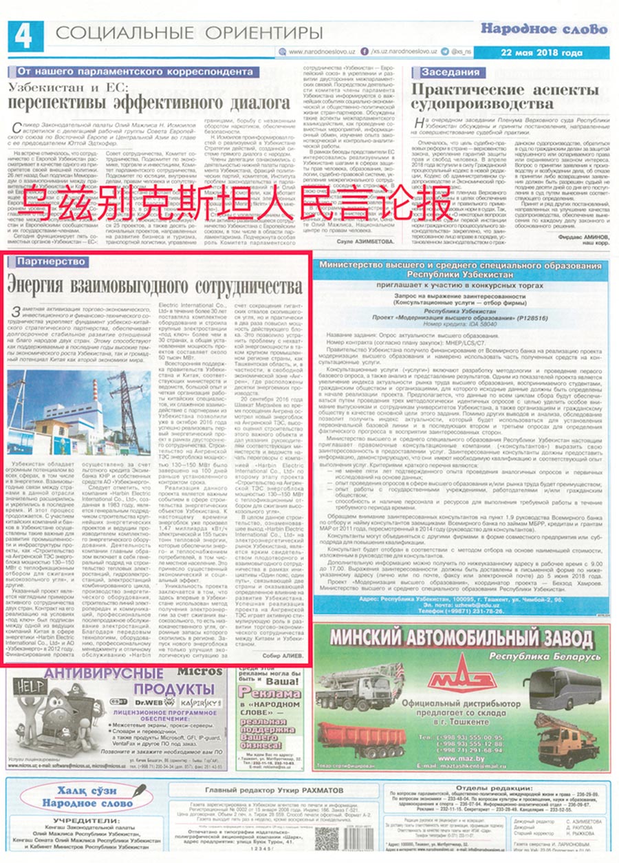 2016年9月,乌兹别克斯坦新任总统沙夫卡特•米尔济约耶夫先生视察安格连电厂新建机组后,给予乐天堂fun88集团高度评价,对机组运行指标和工程质量非常满意。安格连项目机组成功发电正值乌兹别克斯坦独立25周年,成为了乌兹别克斯坦独立25周年的献礼工程。 从质保期开始至2018年5月,安格连项目已历时19个月,机组运行平稳高效。截至目前,项目已累计发电约15亿度,供热抽汽量155000吨,为当地居民用电和用热需求提供了可靠的保证,同时也为乌兹别克斯坦创造了良好的经济和社会效益。在当地其他电厂纷纷停机检修的情况下,安格连项目机组按照乌兹电网调度要求,一直处于满负荷稳定运行状态,保障了电网的稳定和高峰期用电需求,这也充分证明了“乐天堂fun88集团制造”机组的高性能和高品质。 上合峰会进入倒计时,乌兹别克斯坦权威媒体人民言论报、东方真理报和今日乌兹别克斯坦对中乌两国能源合作的标杆项目安格连电厂一期项目进行了报道,宣传了中乌两国产能合作的典范工程。