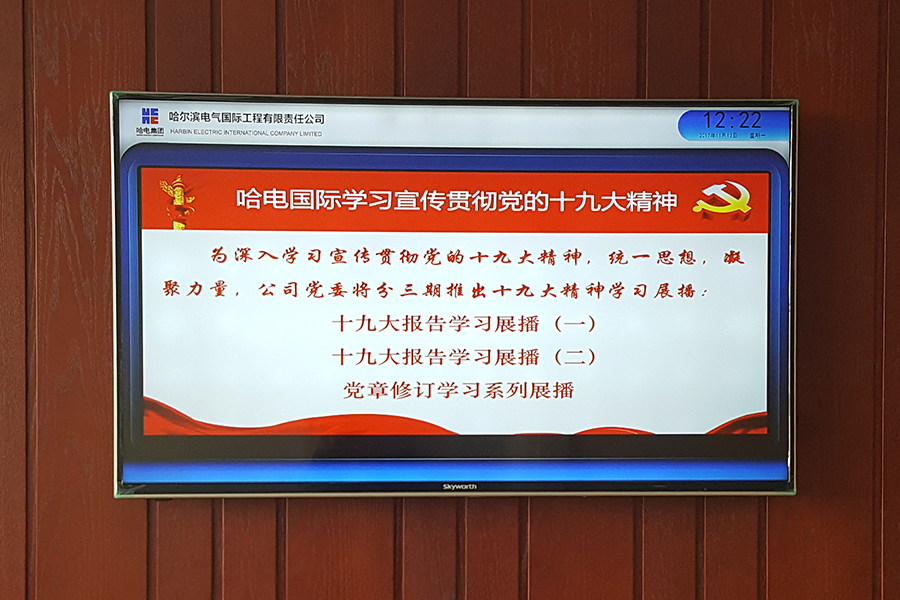 利用公司楼宇电子展播屏分期播放了党的十九大报告学习展播和党章修订学习系列展播,让广大党员干部职工能够随时随地进行学习,使公司上下形成良好、浓郁的学习宣传贯彻党的十九大精神氛围。
