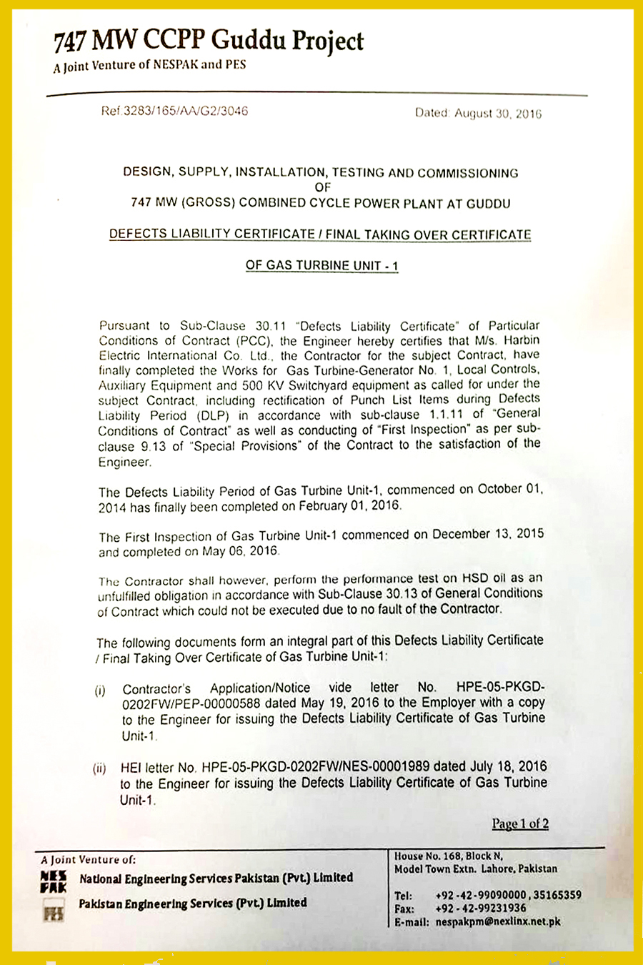 2016年8月31日,乐天堂fun88集团承建的巴基斯坦古杜747MW联合循环电站项目1号燃机收到巴基斯坦业主及监理公司NESPAK颁发的DLC证书,完成正式移交。至此,巴基斯坦古杜项目2台燃机已拿到DLC证书,目前正全力争取全厂DLC证书。