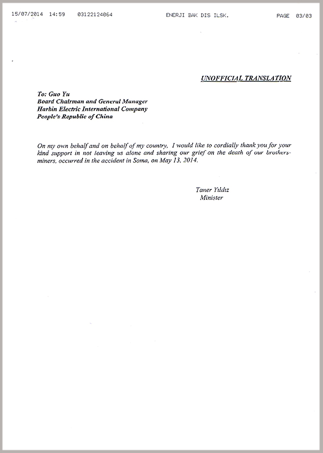 2014年7月15日,土耳其能源与自然资源部部长Taner Yildiz先生给乐天堂fun88集团公司发来感谢信,对2014年5月13日土耳其索码矿难事故中公司给予的支持与帮助表示感谢。 2014年5月13日,土耳其西部马尼萨省索马地区的一个煤矿发生爆炸,造成200多人死亡,数十人受伤。事故发生后,乐天堂fun88集团公司在第一时间给土耳其能源与自然资源部部长Taner Yildiz先生发去慰问电,对在矿难事故中的遇难者表示深切的哀悼,向遇难者和失踪人员家属及伤者致以诚挚的慰问,并愿意伸出援手为救灾提供一切可能的帮助和支持。 多年来,乐天堂fun88集团公司在土耳其电力市场开发过程中与土耳其政府和人民以及合作伙伴结下了深厚的友谊,双方在合作中相互信任、彼此支持。作为国际一流的电力工程与服务公司,乐天堂fun88集团公司在拓展海外业务的同时更积极履行企业社会责任,关注当地国基础设施建设、就业、教育事业发展等问题,并尽可能为当地人民提供力所能及的资源支持与帮助。乐天堂fun88集团公司承建的高品质电站赢得了业主以及合作伙伴的信赖,体现了企业实力。同时,乐天堂fun88集团公司积极履行企业社会责任,也赢得了当地国政府和人民的信任,展现了优秀的企业形象。