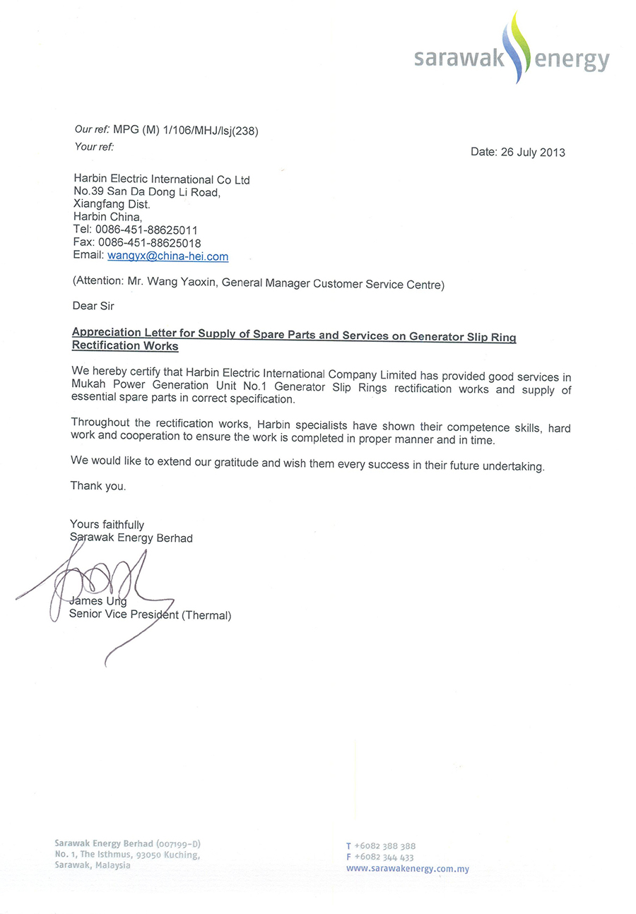 2013年5月,马来西亚沙捞越能源公司所属木胶电厂因发电机励磁端发生故障致使集电环烧毁。乐天堂fun88集团公司接到求助后,经过与该公司1个月的充分沟通与紧密合作,在最短时间内落实了检修技术方案及备品备件供应及专用工具运输等难题,并从2013年7月10日开始,仅用8天时间就圆满完成了全部现场检修工作。机组启动后一次成功并网发电,较业主计划时间提前一周。沙捞越能源公司业主特发来感谢信,对乐天堂fun88集团公司在MPG电站1号发电机集电环紧急抢修工作中提供的优质服务和优质备件表示充分认可,对在紧急抢修工作中所有工程师展现的优秀专业技能和敬业精神以及认真的合作态度表示称赞。