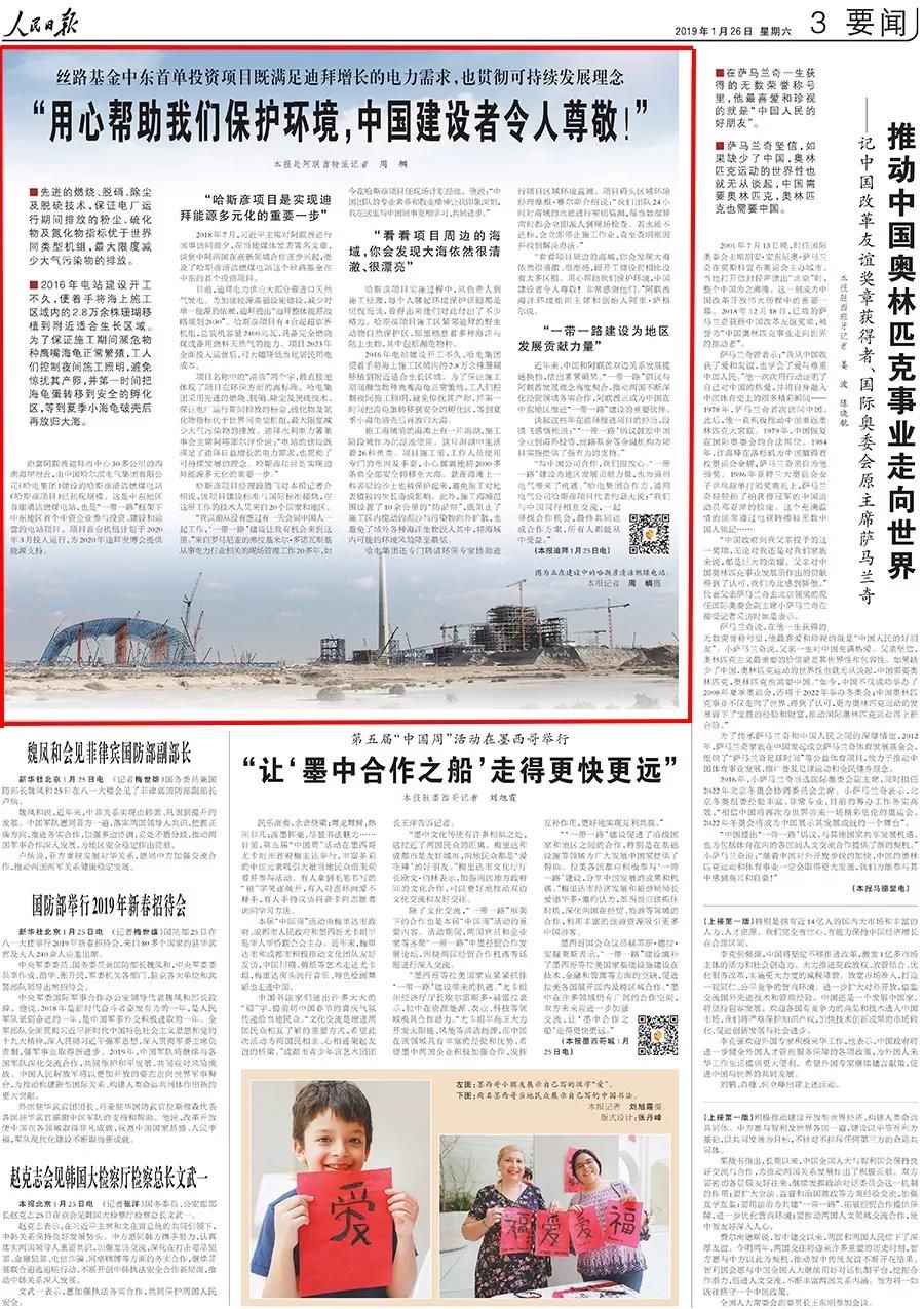 1月26日,《人民日报》第三版要闻刊登了该报记者探访中东第一座清洁燃煤电站的专题报道《丝路基金中东首单投资项目既满足迪拜增长的电力需求,也贯彻可持续发展理念 :“用心帮助我们保护环境,中国建设者令人尊敬!”》。 据了解,阿联酋迪拜哈斯彦4×600MW清洁煤电站项目是乐天堂fun88集团集团首个EPC+BOO项目,也是央企强强联合、团结一致、共同服务海外的典型项目。迪拜哈斯彦项目集中国投资、中国融资、中国总包、中国设计、中国制造、中国建造于一身,创造了中资公司首次以投融资和总承包模式进入中东电力市场的先例。项目严格执行国际最高标准,具有生态环保及EHS要求高,参与项目执行的国际化企业众多等特点。迪拜哈斯彦项目的成功实施,不仅积极带动了众多央企合力出海,走进高端电力市场,更让中东高端电力市场的合作伙伴看到了众多中国央企的实力,而“乐天堂fun88集团品牌”也成为了代表着“中国制造”的央企名片。 “一带一路”倡议推进的五年,也是乐天堂fun88集团集团海外市场拓疆辟土的五年。五年来,乐天堂fun88集团集团国际公司的年均正式合同签约额突破100亿元,在手项目数量逐年递增。在“一带一路”沿线的孟加拉、土耳其、蒙古、巴基斯坦、阿联酋等市场共签订9个大型电站总承包合同,累计合同额达73亿美元。在印尼、土耳其、巴基斯坦、孟加拉、阿联酋、印度、蒙古、乌兹别克斯坦等“一带一路”沿线国家承建海外项目在建项目16个,分布10个国家和地区,总合同额累计83.93亿美元,累计出口报关额21.7亿美元,为“一带一路”伟大蓝图建设贡献了乐天堂fun88集团力量,为国家电力设备和电力工程出口作出了突出贡献。