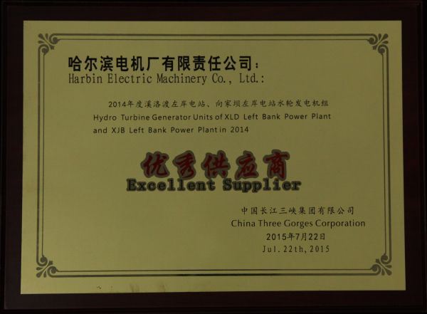 2015年7月开始,按照《中国长江三峡集团公司机电设备优秀供应商评选办法》,中国长江三峡集团公司对2014年度溪洛渡、向家坝水电站机电设备优秀供应商开展了考核终评工作。通过设备制造与验收、设备交货仓储物流、设备现场安装调试、设备运行消缺检修4个方面的考评,电机公司荣获2014年度溪洛渡、向家坝优秀供货商荣誉称号。