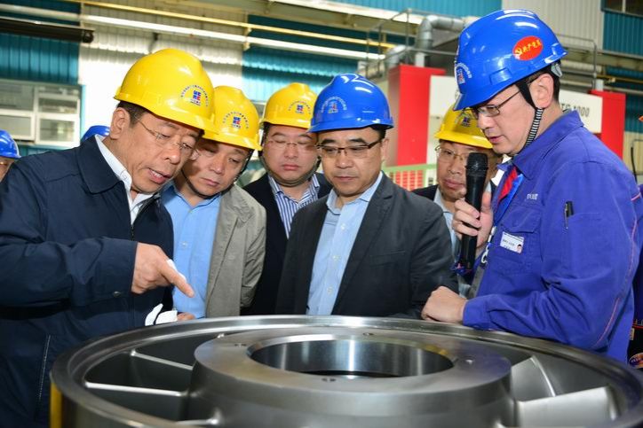 任洪斌(左一)在邹磊(右二)的陪同下参观动装公司的生产现场