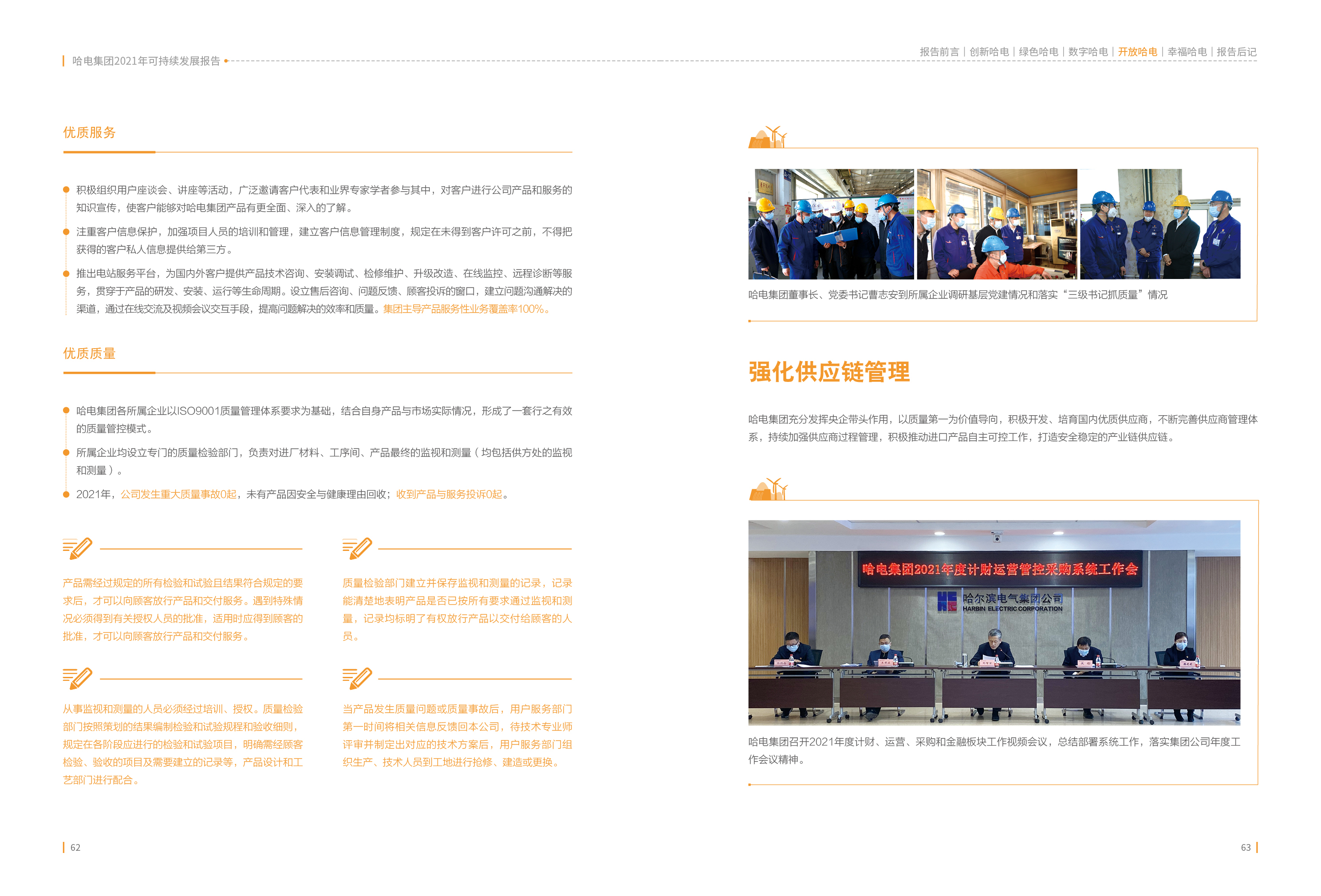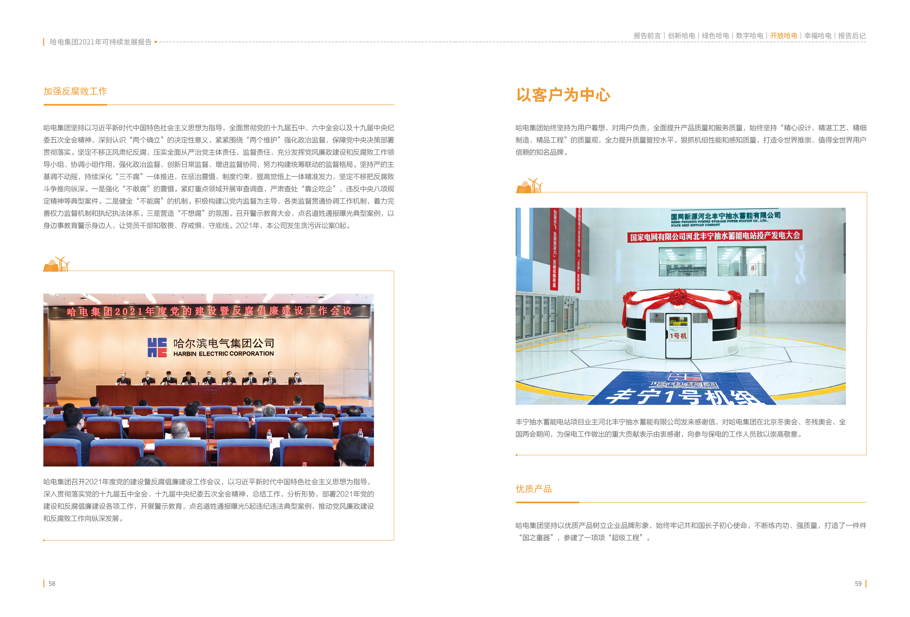 《乐天堂fun88集团集团2021年度可持续发展报告》参照联合国可持续发展目标和中国社会科学院CASS-CSR4.0标准,以“友好环境、温馨家园”的社会责任观为主题,紧扣国家发展战略和乐天堂fun88集团集团转型发展目标,多方位、个性化展现公司可持续发展能力和水平。 《乐天堂fun88集团集团2021年度可持续发展报告》以“创新乐天堂fun88集团”、“绿色乐天堂fun88集团”、“数字乐天堂fun88集团”、“开放乐天堂fun88集团”、“幸福乐天堂fun88集团”为主体内容,全面展现乐天堂fun88集团集团2021年在改革发展、客户责任、贡献社会、保护环境、爱护员工等方面取得的成绩。通过“以高质量党建引领高质量发展”、“70载书写光荣与梦想”、“白鹤亮翅尽展大国重器——为全面践行‘双碳’战略目标贡献乐天堂fun88集团力量”、“履行政治责任、助力乡村振兴”、“沉淀企业文化、凝练乐天堂fun88集团精神”五个责任专题,聚焦乐天堂fun88集团集团在党建引领、70年发展历程、打造精品工程、助力乡村振兴、沉淀企业文化等领域的重点工作成效,彰显了中央企业的责任担当。 站在新起点、奋进新征程,乐天堂fun88集团集团将坚持以习近平新时代中国特色社会主义思想为指导,胸怀“两个大局”,心系“国之大者”,坚决贯彻党中央、国务院决策部署,认真贯彻落实习近平总书记关于碳达峰碳中和、构建新型电力系统等重要讲话重要指示批示精神,完整、准确、全面贯彻新发展理念,积极把握能源转型带来的有利机遇,坚持产业高端化、智能化、绿色化发展方向,全力围绕以新能源为主体的新型电力系统、绿色低碳的驱动系统、清洁高效的工业系统“三个系统”优化产业布局,加快推进设备制造商、系统集成商、运维服务商“三商”转型,以更强责任、更严要求、更实举措,扎实有力推进各项工作,全力打造我国装备制造业的百年老店,努力建设具有全球竞争力的世界一流装备制造企业,以优异成绩迎接党的二十大胜利召开。