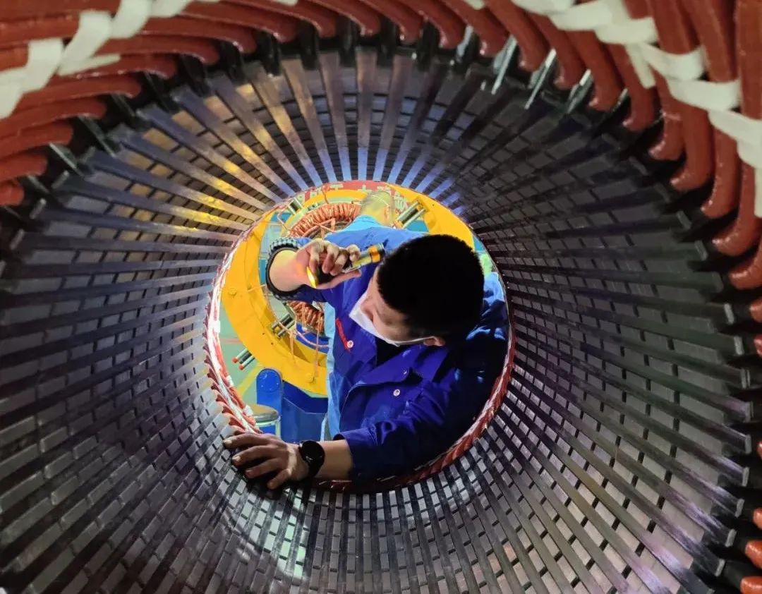 电机公司青年职工在白鹤滩水电站检查安装水平度