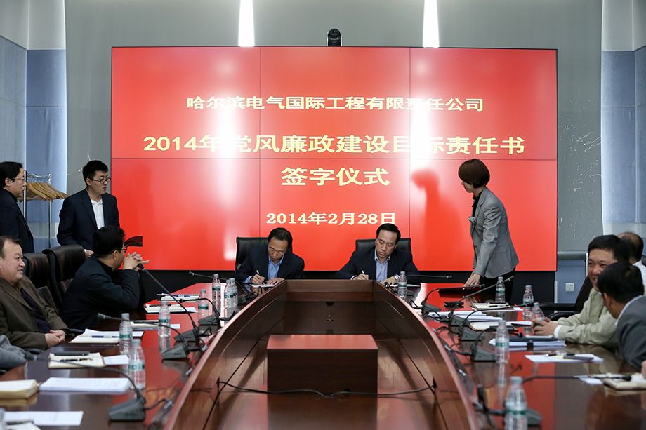 2014年2月28日,乐天堂fun88集团召开2014年度党风廉政建设工作会议。乐天堂fun88集团董事长、总经理、党委副书记郭宇,党委副书记、纪委书记张立伟,副总经理董银柱、杨庆利,总会计师王惠荣出席会议。张立伟主持会议并传达学习了集团公司党委书记、董事长宫晶堃在乐天堂fun88集团集团2014年度反腐倡廉工作会议上的讲话精神和党委常委、纪委书记白绍桐的工作报告,同时代表公司党委与各部门代表签订了《2014年党风廉政建设责任书》和《2014年党建工作目标责任书》。